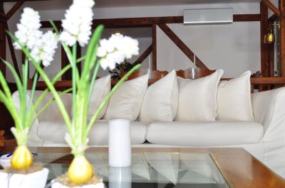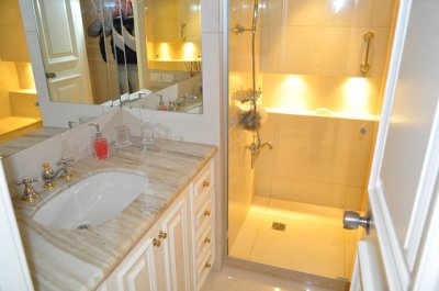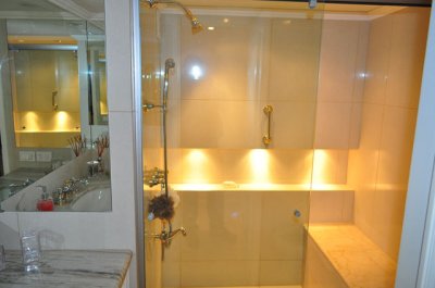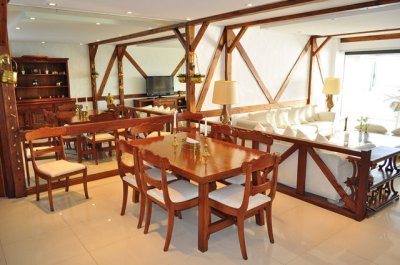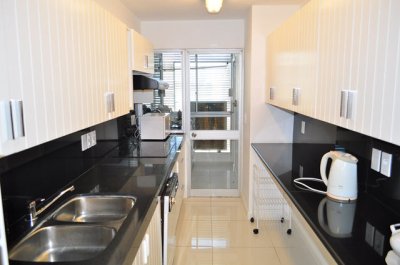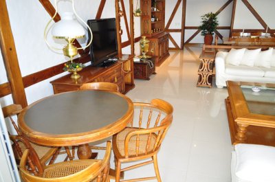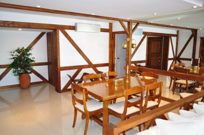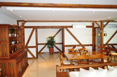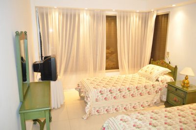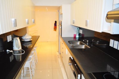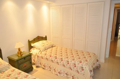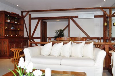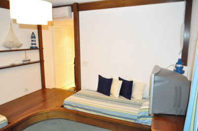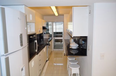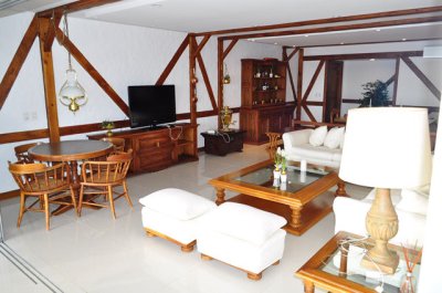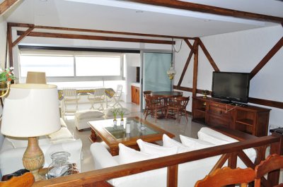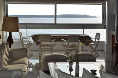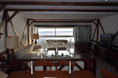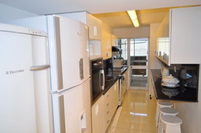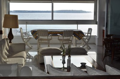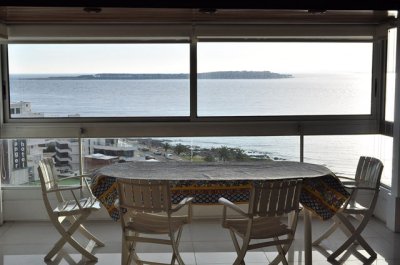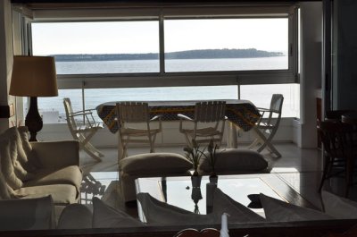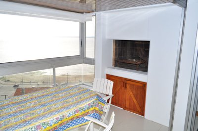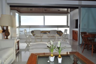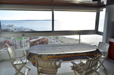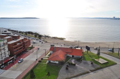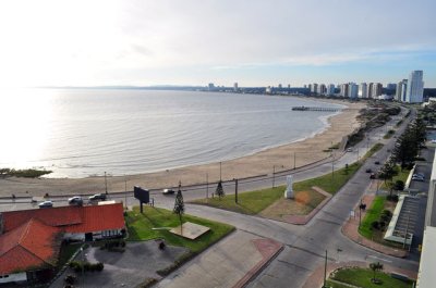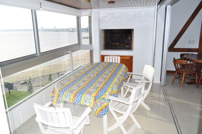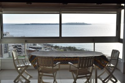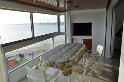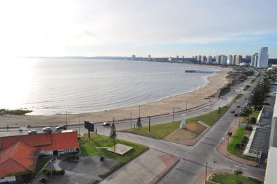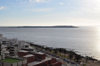 torre frente al mar con serv de mucama y de playa gran terraza con parrillero viendose el atardecer y el sol escondiendose detras de la isla una vista panoramica