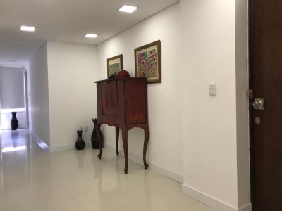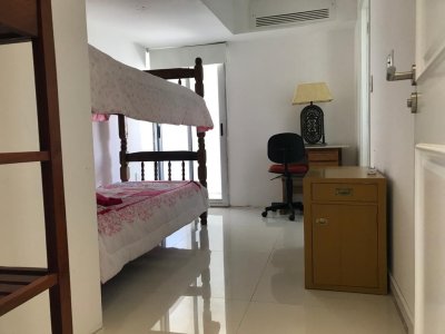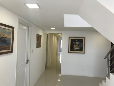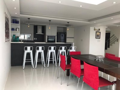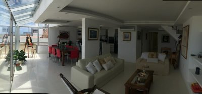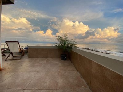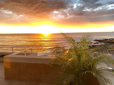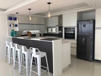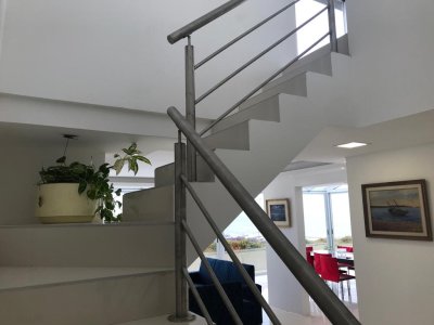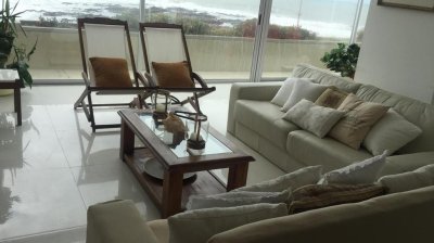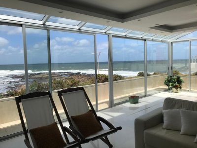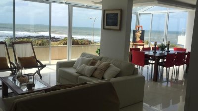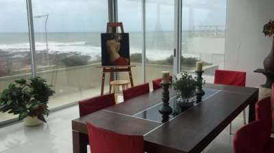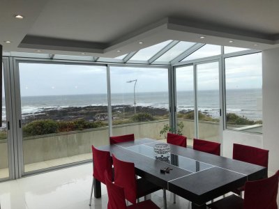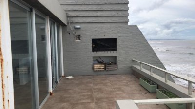 3 dormitorios, 2 baños y dependencia de servicio con baño. Terraza con vista al mar que se accede desde el living. Living con estufa a leña. Cocina con terraza lavadero y parrillero. Arriba otra terraza grande con parrillero propio y vista plena a la brava. Garage amplio con Box propio.