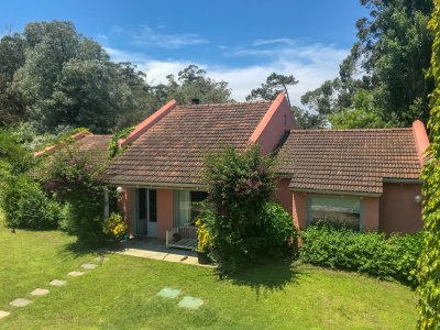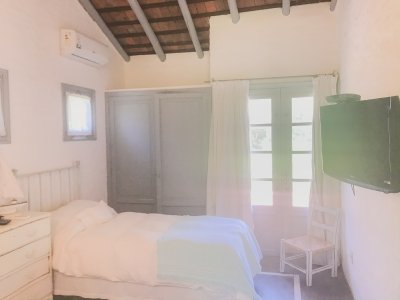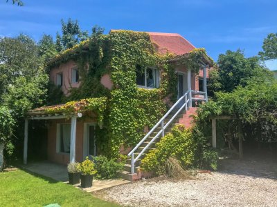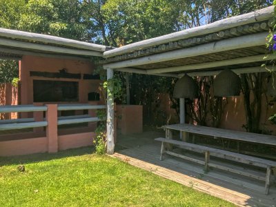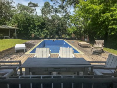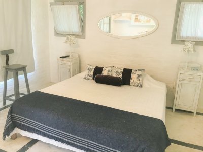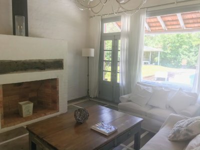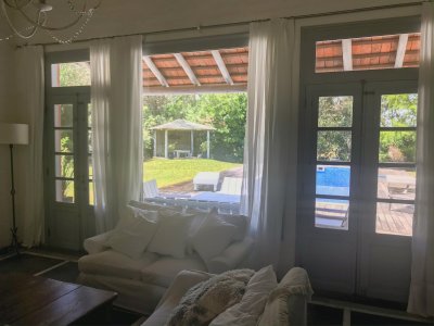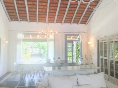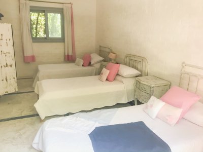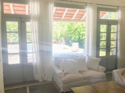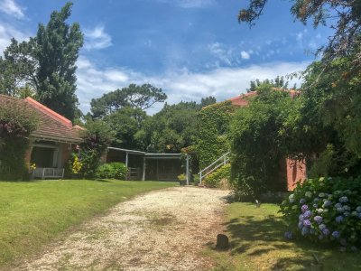 Propiedad de estilo Mediterráneo en La Barra. La casa principal cuenta con gran living-comedor con estufa a leña, amplios ventanales que integran las áreas exteriores. Cocina definida, master suite, 2 dormitorios secundarios con baño completo y medio dormitorio adicional. Independiente de la casa, gran zona de huéspedes formada por: loft con cocina y baño, 3 dormitorios con 3 plazas cada uno y otros 2 baños completos. Dependencia de servicio con baño. En total hay capacidad para 20 huéspedes. Gran barbacoa y jardín con piscina.