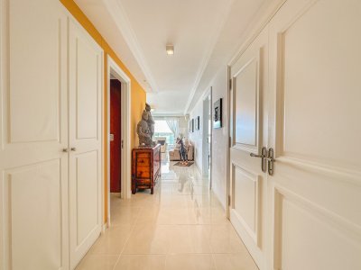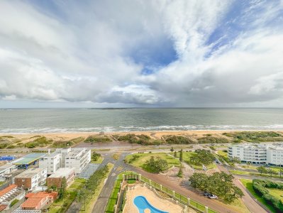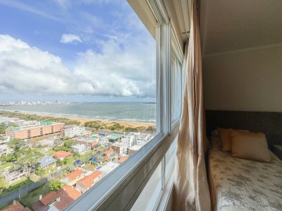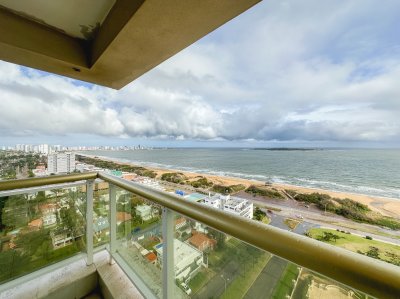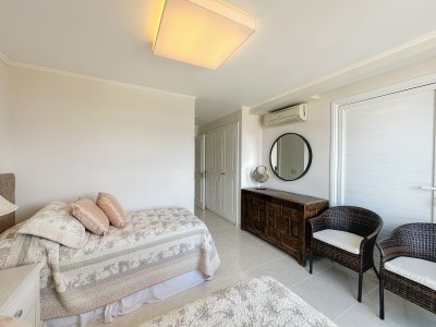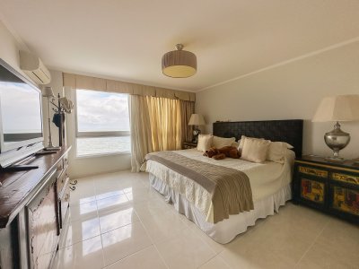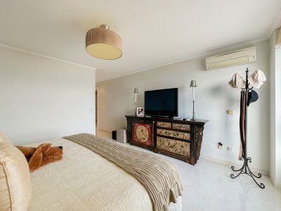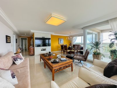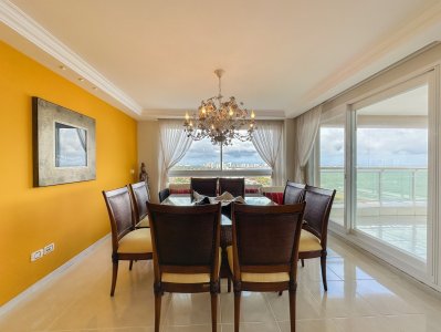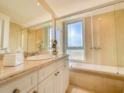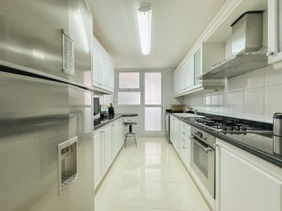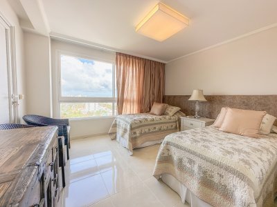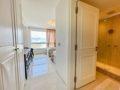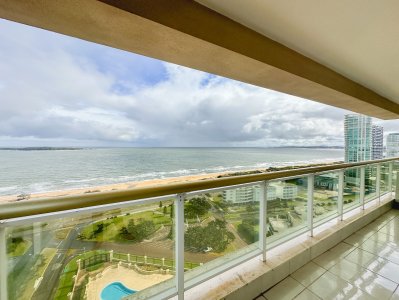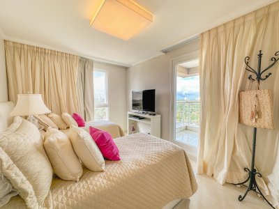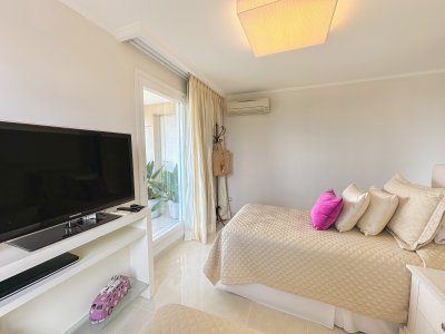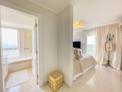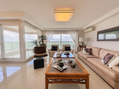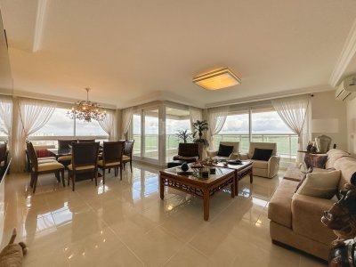 Impactantes vistas a toda la bahía y Península desde este piso alto esquinero en Le Jardin. Extensa terraza, amplio living-comedor, cocina definida con lavadero. 3 dormitorios en suite (3 baños) más toilette y dependencia de servicio con 4° baño completo. Loza radiante sectorizada y aire acondicionado en todos los ambientes. Amenities de primera categoría.