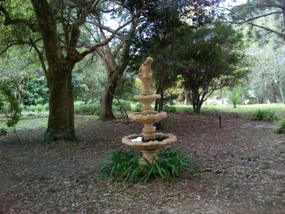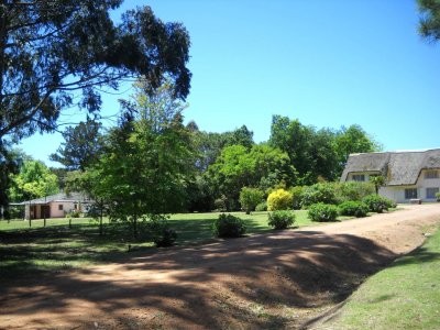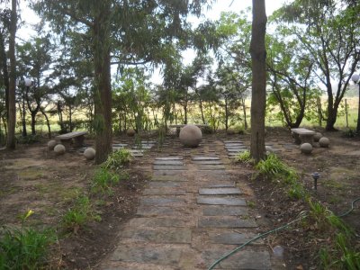 El jardín que rodea las construcciones esta cuidadosamente iluminado. Pudiendo apreciar la gran variedad de especies de árboles. El parque es poblado por dos añejos tilos, arboles indígenas, 4 ombúes de más de 150 años, al igual que un imponente gomero que parece llegar al cielo. A partir de la Casa Principal se dibujan distintos senderos que llevan a descubrir íntimos espacios como el sector de la Plaza que se ve en la foto. Conviven más de 20 variedad de árboles: Robles, Paraísos, Ceibos, Jacaranda, Palo Borracho, una enorme Acacia Negra, Pencas, Liquidámbar, Nogal, Coronilla, Palmeras, Limoneros, Ciruelos, Membrillos, Pomelos, Ciruelos etc.