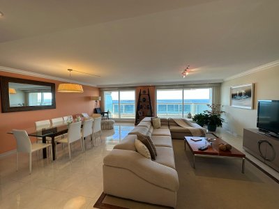Espectacular departamento unificado en ed de playa mansa, excelentes servicios, planta amplia de 4 dormitorios en suite, living comedor, cocina con isla, gran terraza, habitacion de servicio independiente, Vista directa al mar